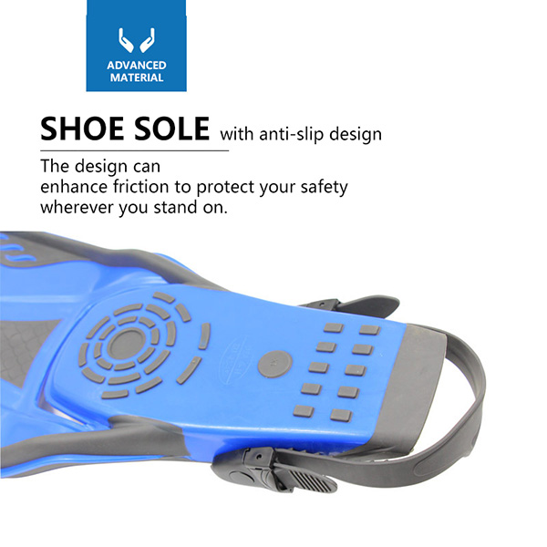 1) Special drainage system to speed fast with less power; 2) Non-slip sole to prevent falling; 3) Anti-loosening adjust buckle to take on/off easier; 4) Adjustable strap to adapt different size of the feet. |