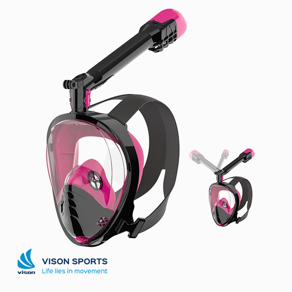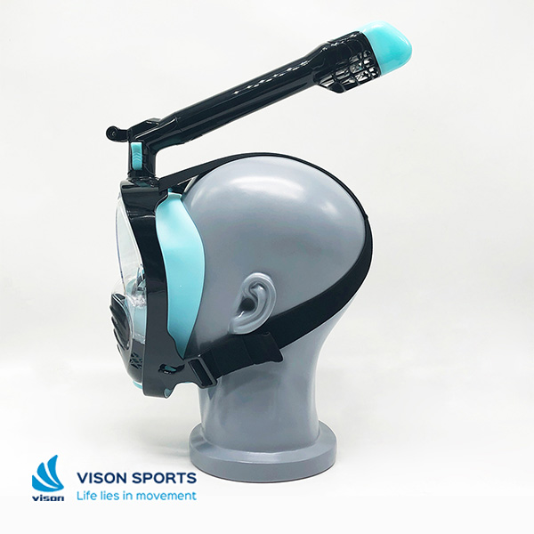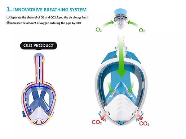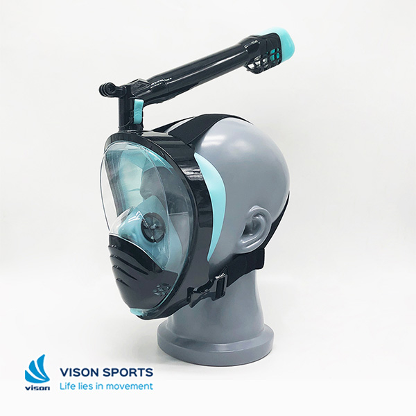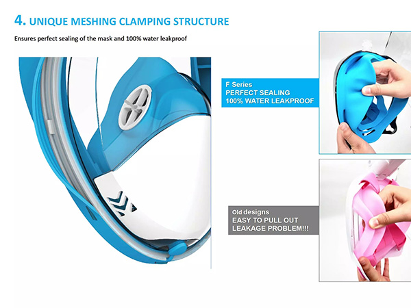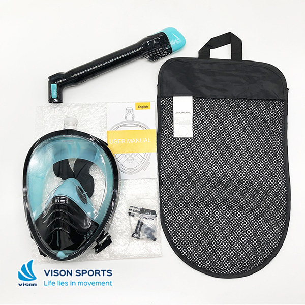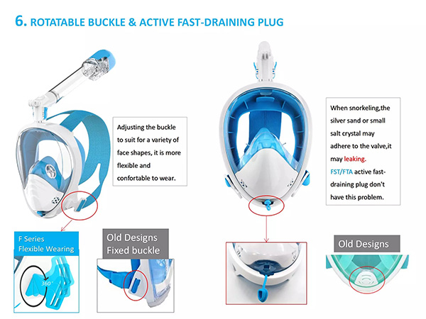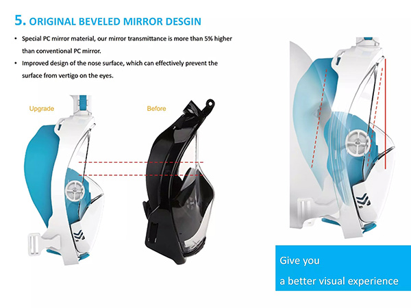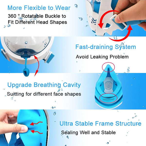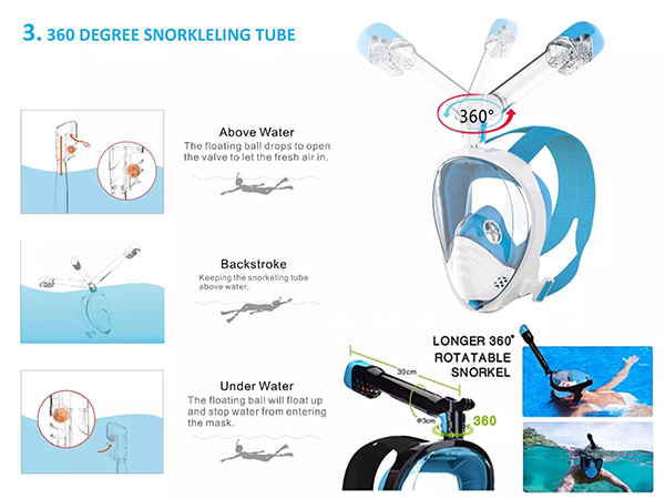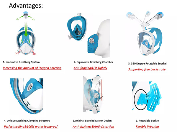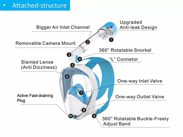 1) Anti-leak design; 2) Anti-fog design; 3) Detachable camera mount design; 4) 180 degree panoramic view; 5) 360 degree snorkel tube 6) Adjustable elastic band with rotatable buckle; 7) Active fast-draining system. |