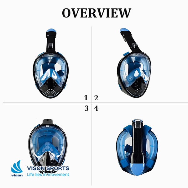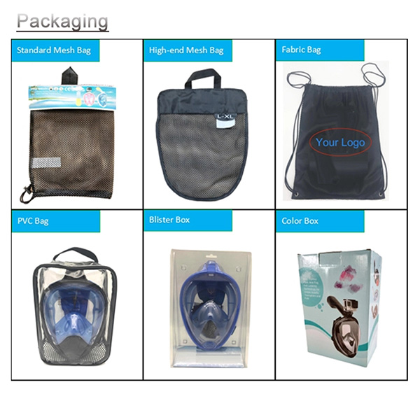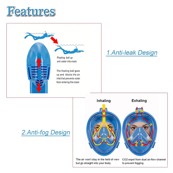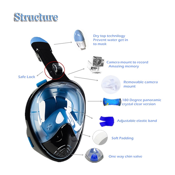 1) Anti-leak design; 2) Anti-fog design; 3) Removeable camera mount design; 4) 180 degree panoramic view; 5) Adjustable elastic band. |