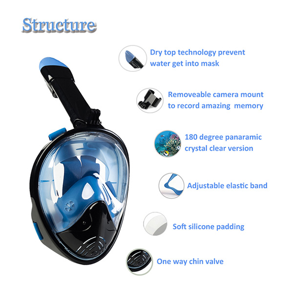 1) Anti-leak design; 2) Anti-fog design; 3) Removeable camera mount design; 4) 180 degree panoramic view; 5) Adjustable elastic band. |
