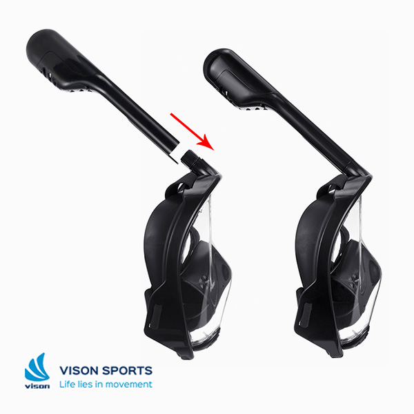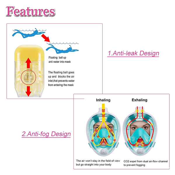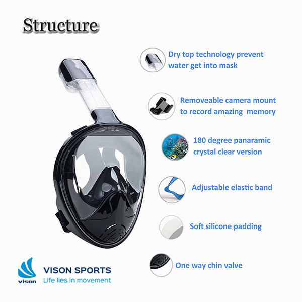 1) Anti-leak design; 2) Anti-fog design; 3) Removeable camera mount design; 4) 180 degree panoramic view; 5) Adjustable elastic band. |